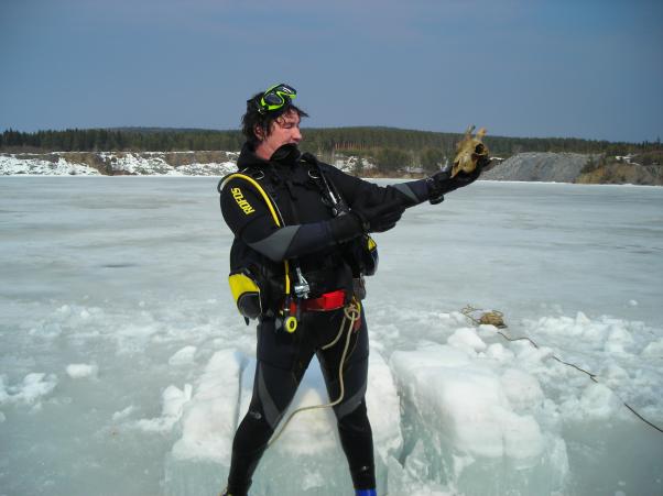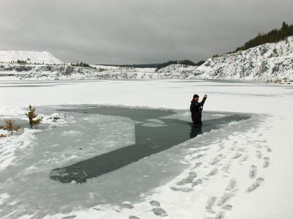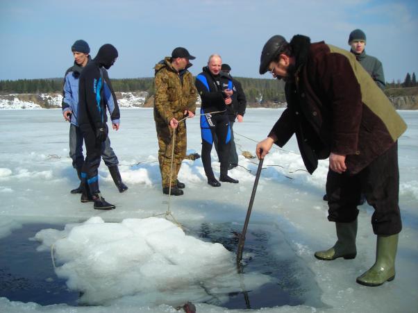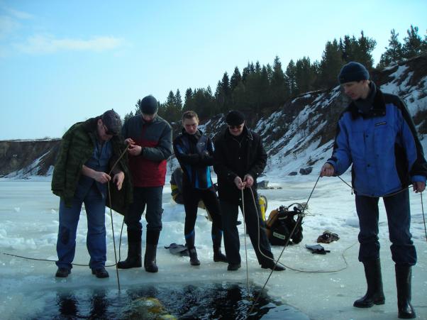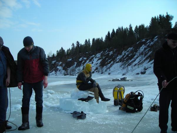 Что ж, ещё один зимний дайв "записан" в память...Всё прошло замечательно: порадовала тихая, безветренная и слегка морозная ( до -17С) красота зимнего карьера. Бензопила и нетолстый лёд позволили пропилить майну без особых усилий,а тёплая палатка и дружеская компания позволили чувствовать себя уютно после довольно холодной воды( †3С у поверхности и †4С глубже) и продолжительного пребывания в ней ( у меня дайв длился 60 мин.)
