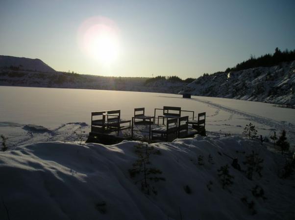 Сегодня навестили свой любимый карьер: лёд стоит по всей поверхности( неделю назад были только намёки). И это не смотря на довольно таки тёплую погоду - сегодня вообще плюс. Толщина льда сантиметров пять, стоять можно, но рисковать не стали - пробили майну от берега.